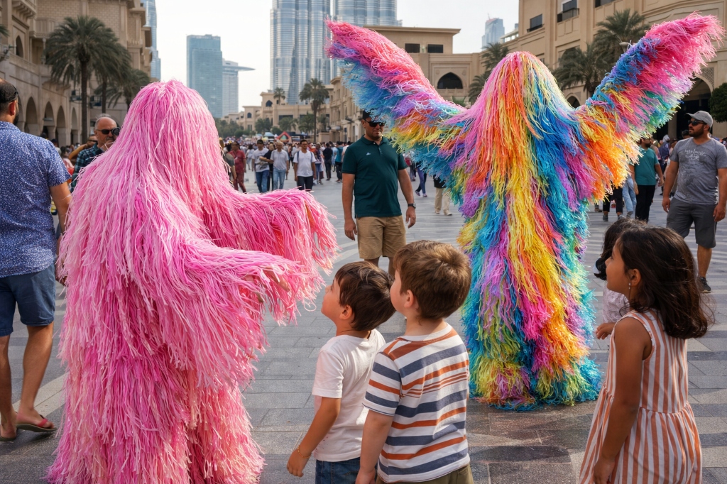 Vibrant, playful, and high-fashion. The Colorful Pompoms Woman combines the tactile fun of our monster series with a chic, editorial silhouette. A perfect walking photo opportunity.