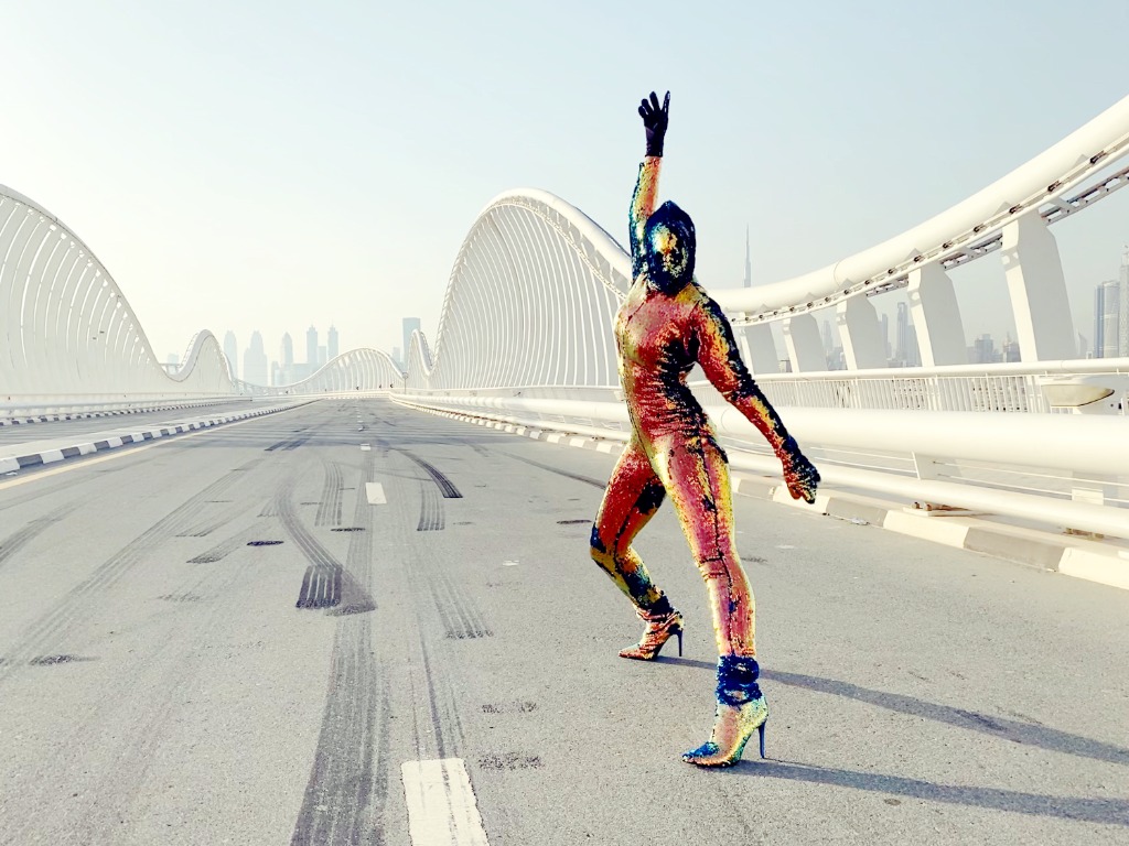 High-fashion extraterrestrial aesthetics featuring iridescent sequin bodysuits and holographic helmets.