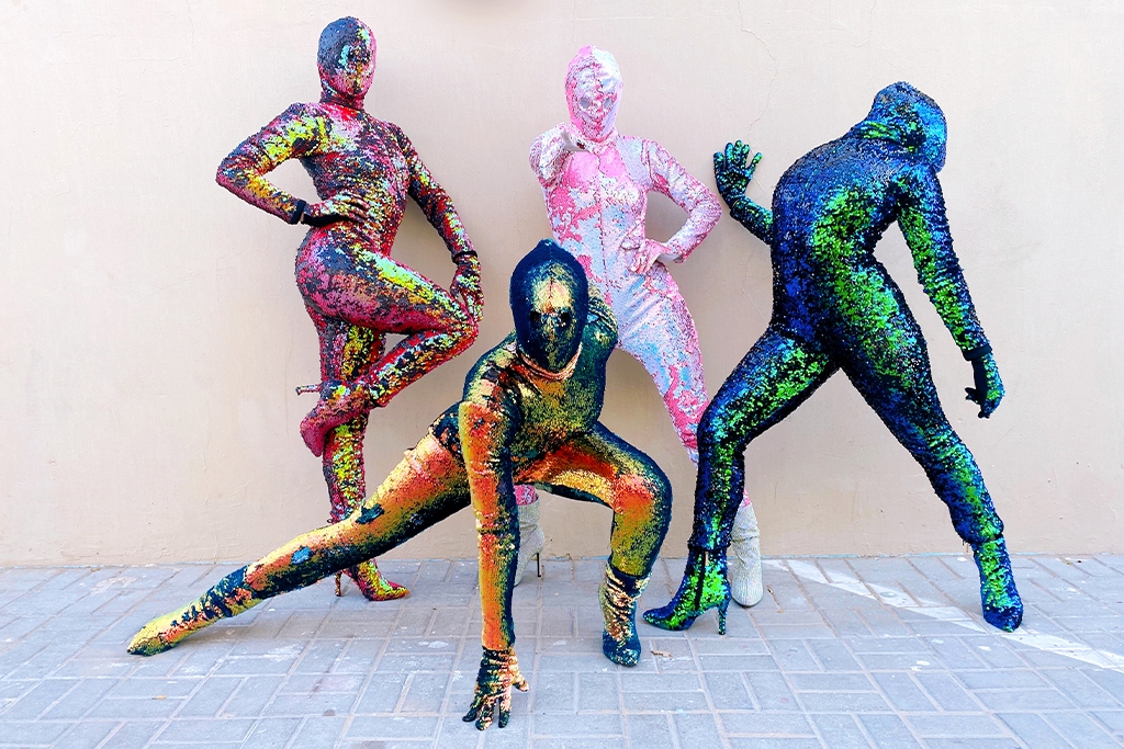 A clean, sophisticated take on sci-fi performance art. The Cosmic Girls bring a high-fashion edge to the roster, combining sleek iridescent textures with custom holographic headpieces. Their movement is fluid, geometric, and otherworldly. Most effective in sleek, modern venues where their metallic surfaces can pick up the ambient lighting design, they represent the future of luxury event hosting.