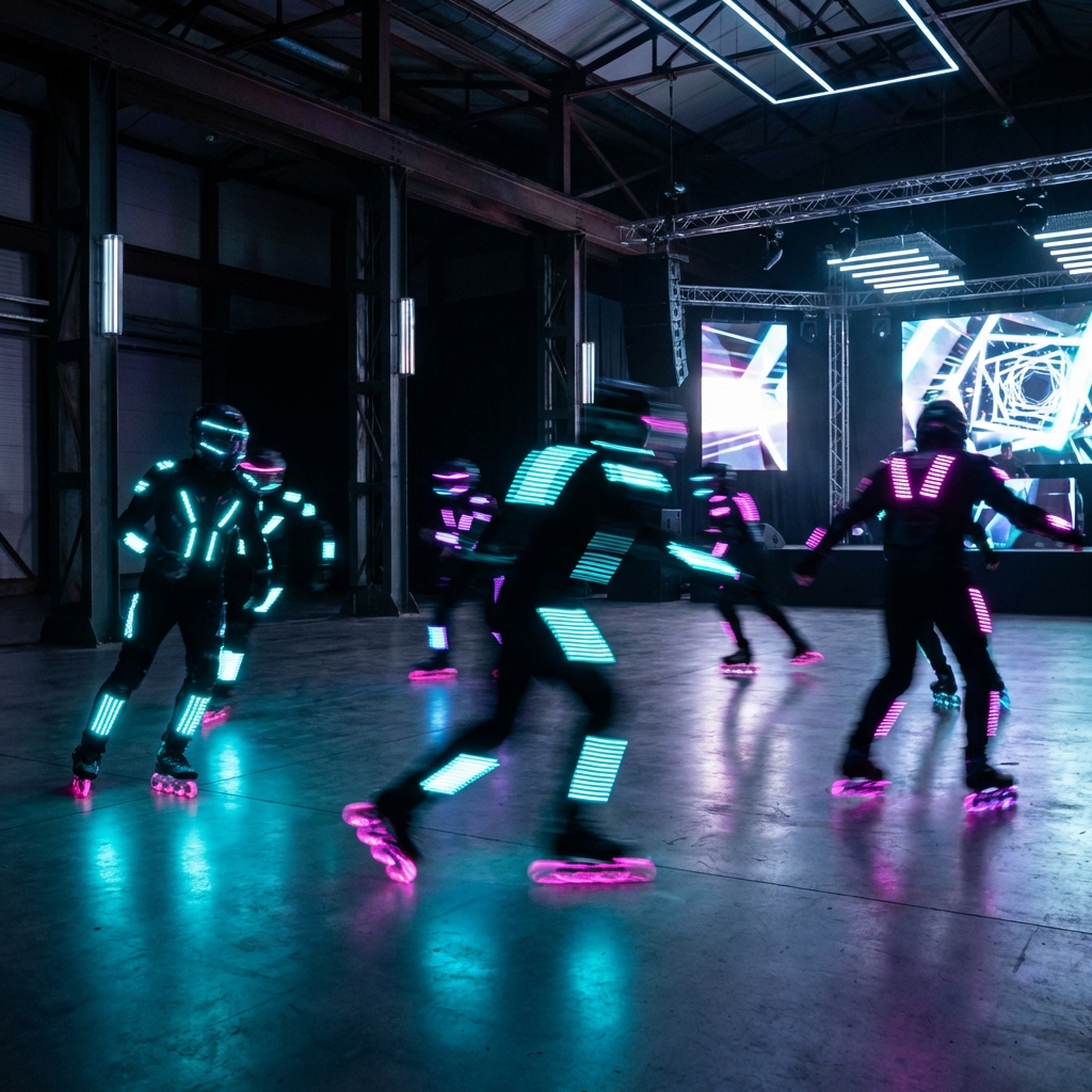 Fluid motion on wheels. Our roster of Roller Skaters includes various themes to match your event, from high-tech LED suits to playful plush costumes and vibrant retro Barbie aesthetics.